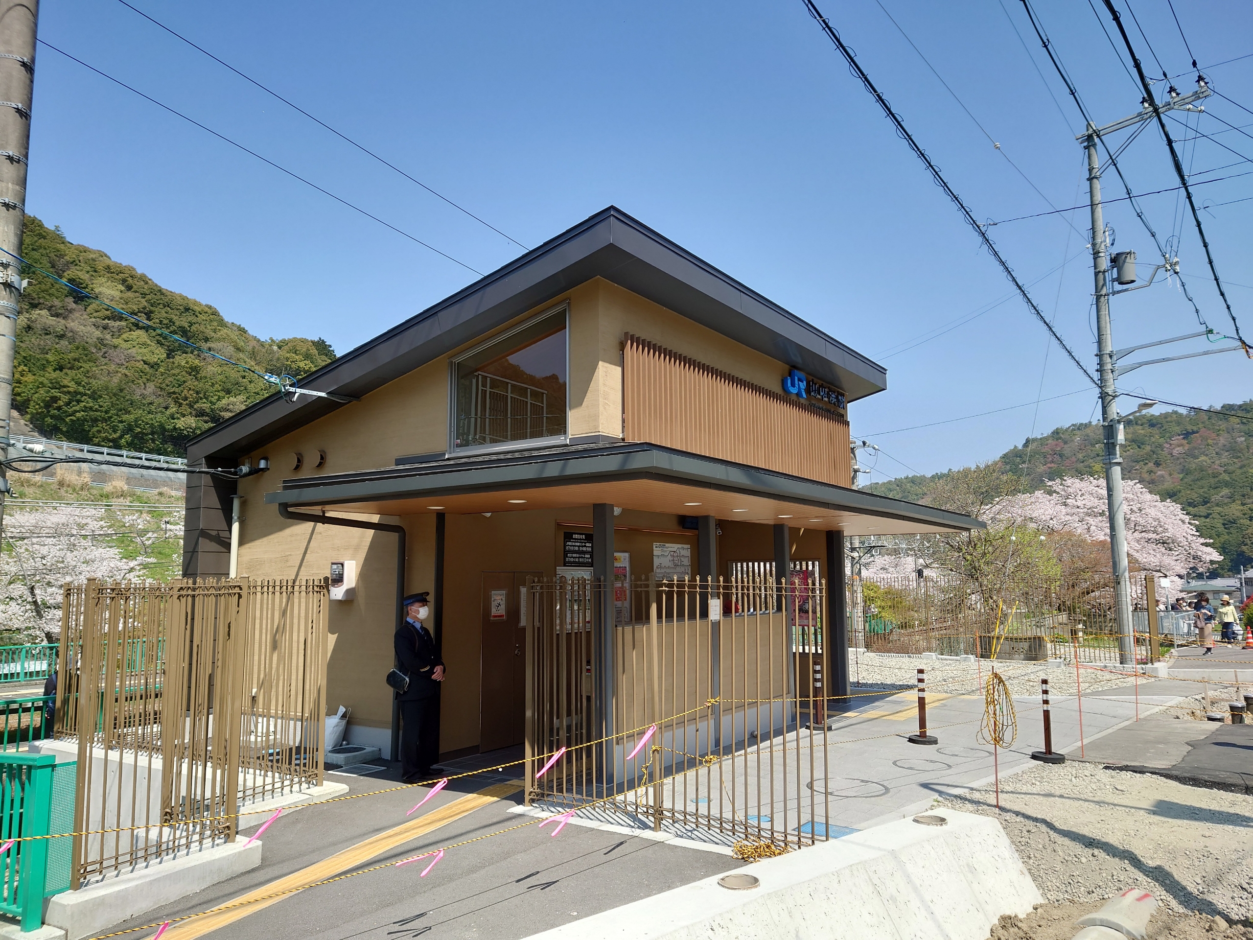 ただ、付近は引き続き府道の拡張工事中であり、また旧駅舎では近くにあったと思われる桜の木も撤去されたことから、「桜と新駅舎」の写真を撮るのには、若干工夫が必要かも知れません…