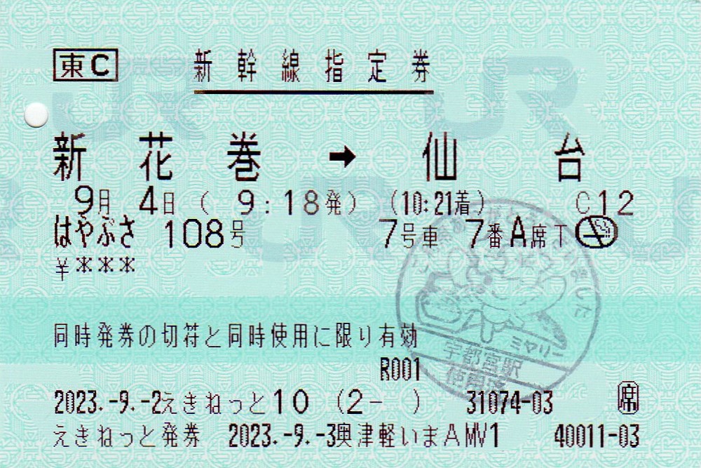 上記画像は、今回乗車した「はやぶさ108号」の新幹線指定席券です。