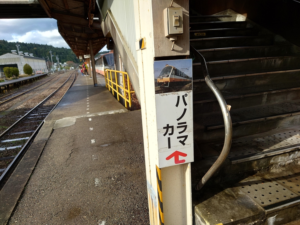 こちらの記事でご紹介したように、のと鉄道の観光列車「のと里山里海号」に乗車し、穴水駅に到着しますと、ホームの先に何やら「パノラマカー」という案内がありました。