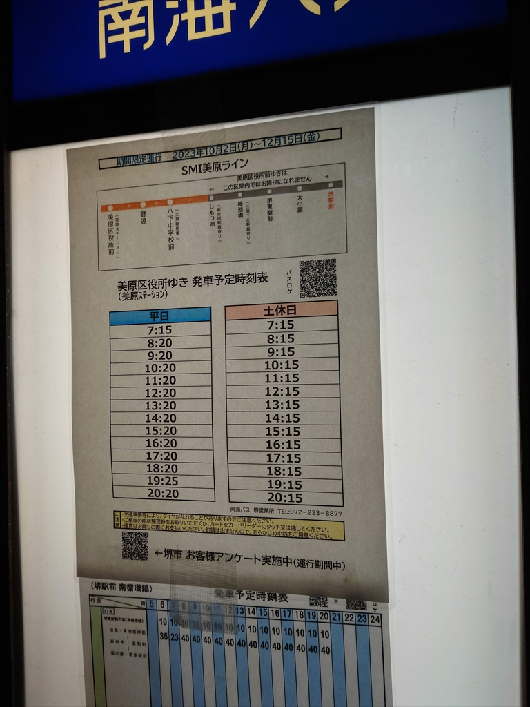時刻表によりますと、堺駅前15時20分発、美原区役所前16時5分着の便のようです。