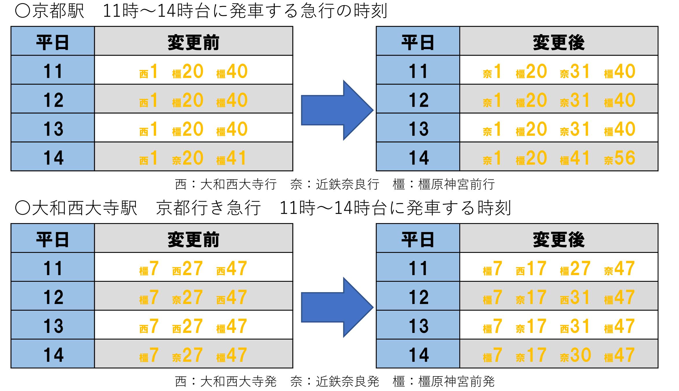 今回は、この京都線の急行を1時間に1本増発することに加え、大和西大寺発着を奈良発着(一部大和西大寺発は存続)とし、両都市間を直結する急行列車が運転されることとなります。