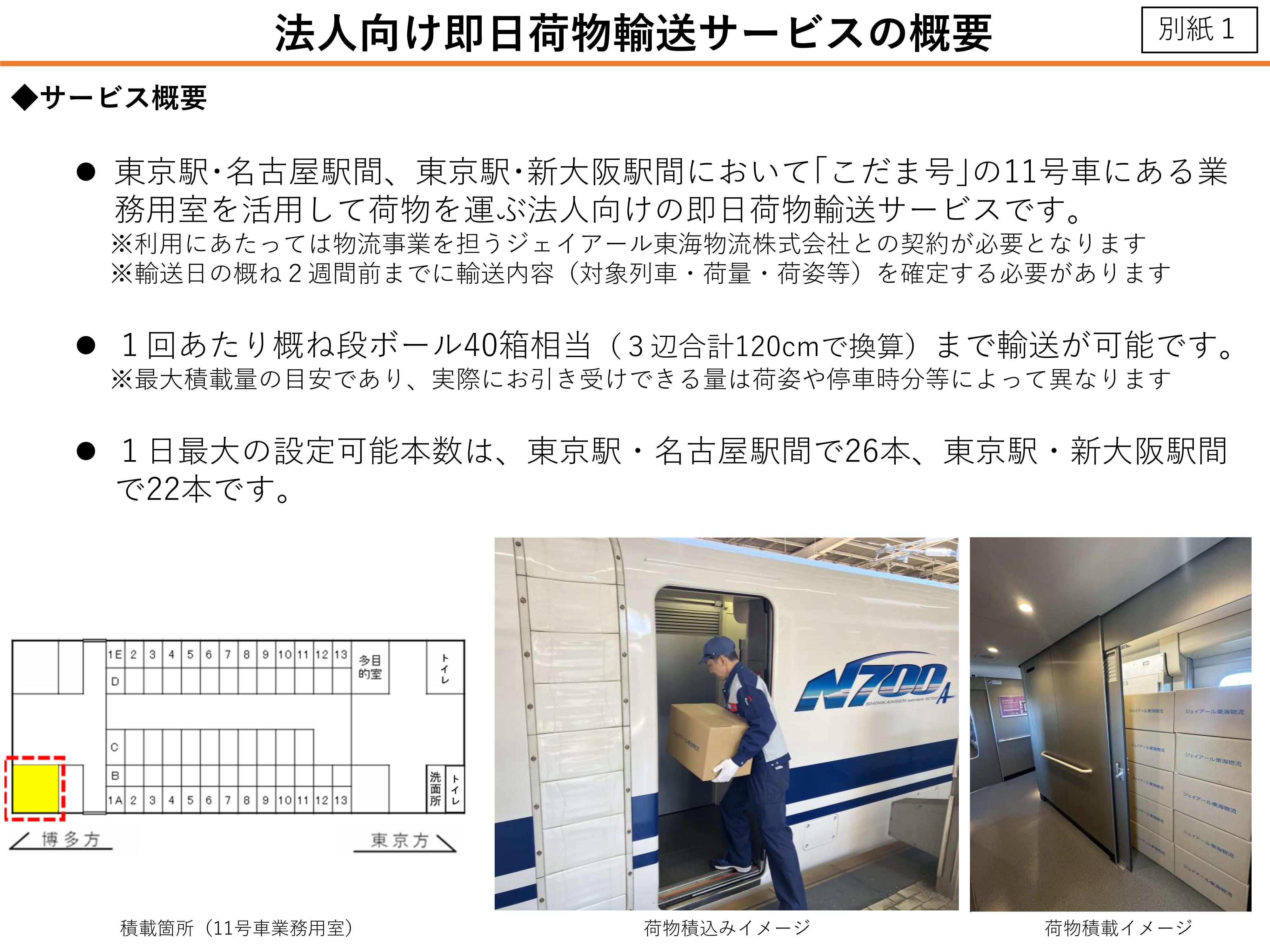 ・東京駅・名古屋駅間、東京駅・新大阪駅間において、「こだま号」の11号車にある「業務用室」を活用して荷物を運ぶ、法人向けの即日荷物輸送サービス。