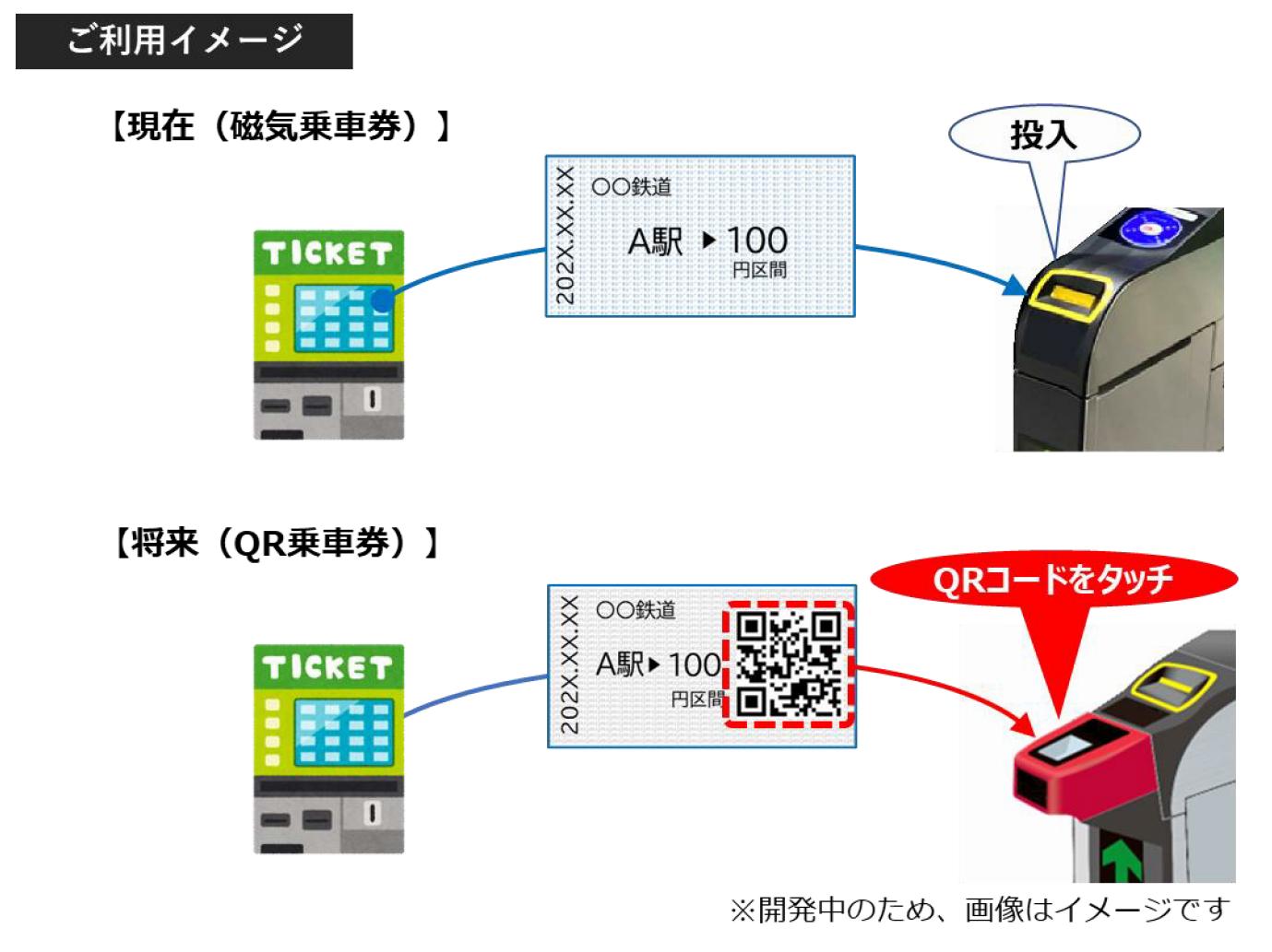 磁気乗車券を出改札機器へ投入する方式から、QR乗車券のQRコードを出改札機器のQRリーダーにタッチする方法へ変更。