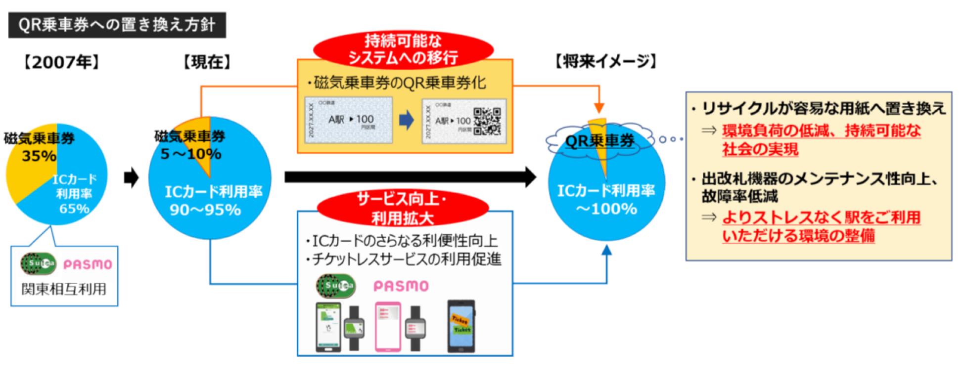 一方、東日本地区の鉄道事業者を見てみますと、JR東日本では2024年下期にQRコードを使用した新たな乗車サービス導入を発表しているほか、東武鉄道では2024年度までの4カ年を期間とする「中期経営計画2024〜2027」において、QR乗車券の導入による磁気乗車券の全廃を発表しています。