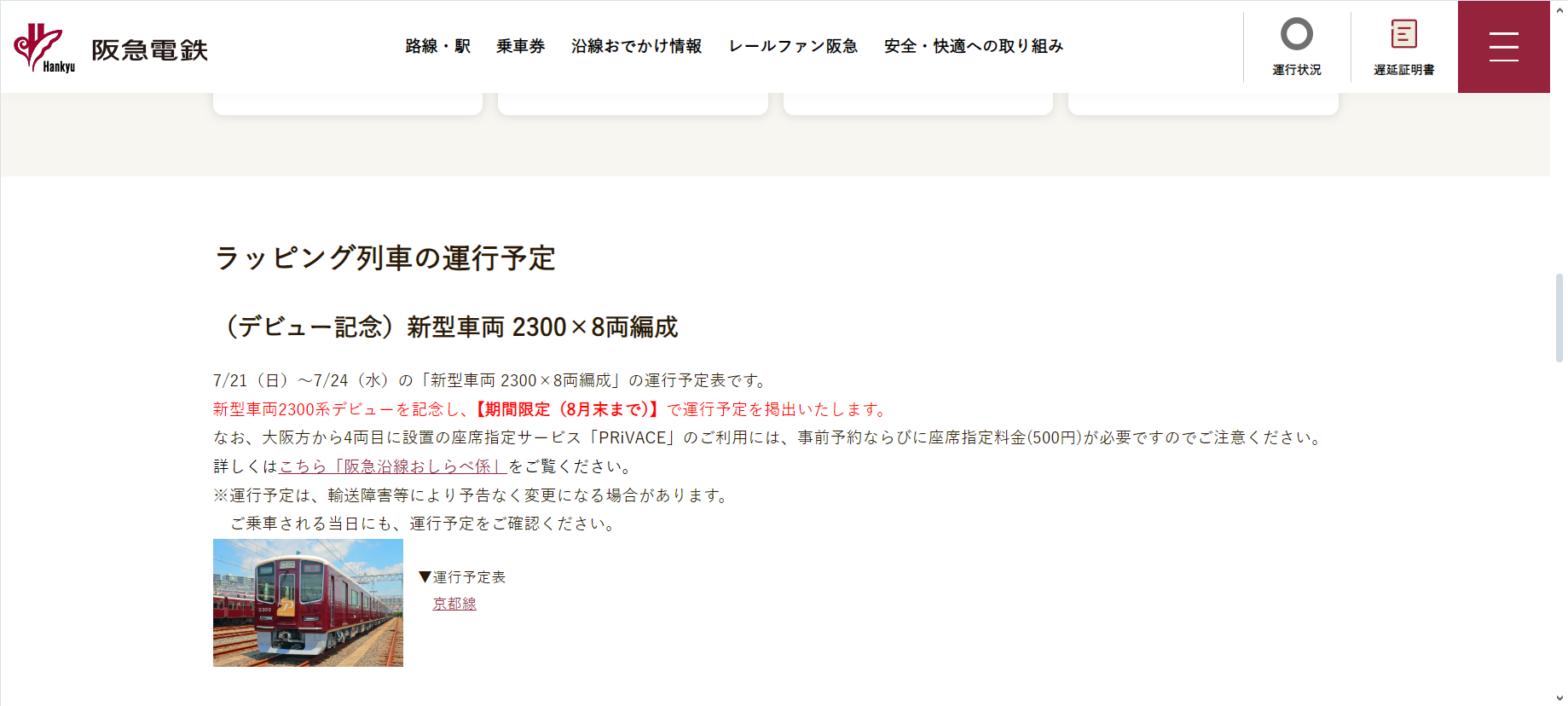 その新型車両2300系ですが、8月末までの期間限定で、阪急電鉄のWebサイトで運行予定が公表されていますので、ご紹介します。