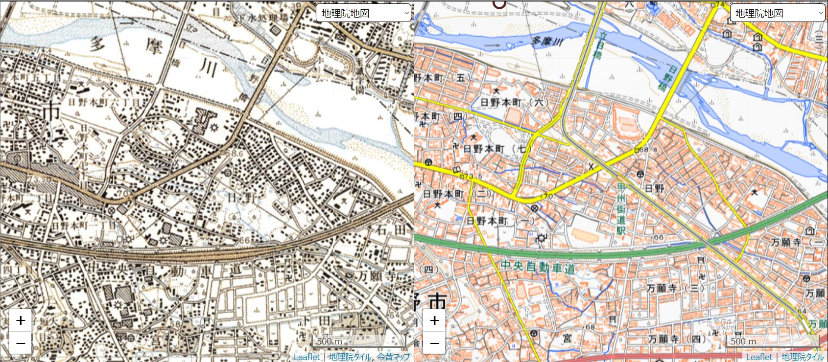 私が住んでいた中央線沿線でも、多摩都市モノレールの開業を期に街並みが大きく変化したエリアも見受けられ、特に甲州街道(日野市)の周辺は、かつては最寄りの鉄道駅からかなり距離のある地域でしたが、この多摩都市モノレール開業により、立川や高幡不動といった鉄道駅と直結することとなったことから、現在では住宅やマンションが多く建ち並んでおり、モノレールがもたらした街並みの変化を地図上からでも容易に観察することができます。