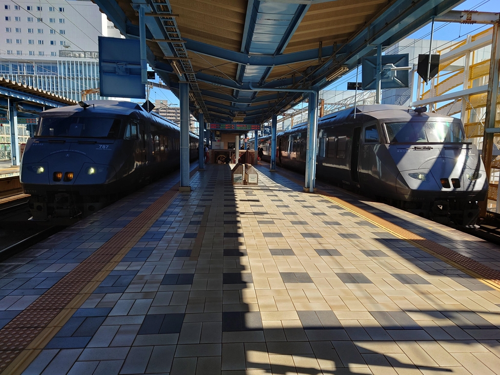 ▲特急「きりしま」と「ひゅうが」が並ぶ宮崎駅
