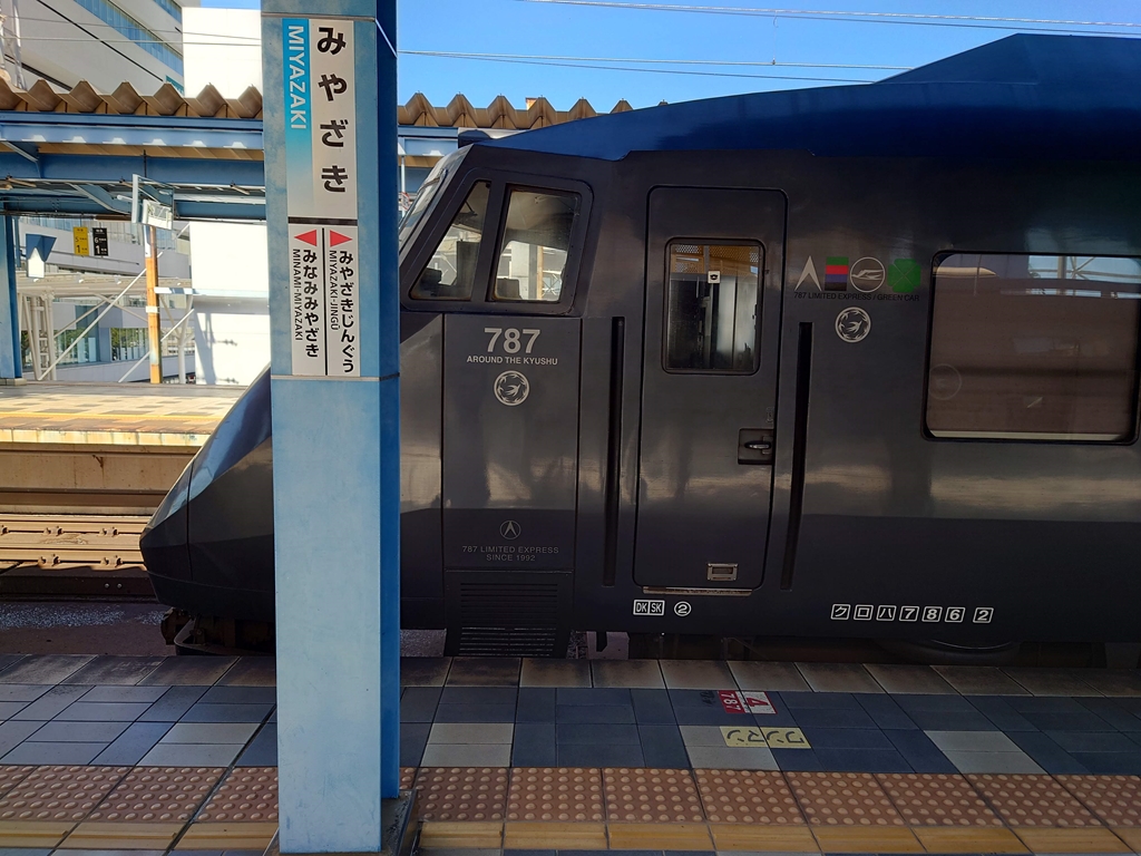 ▲宮崎駅の駅名標と787系
