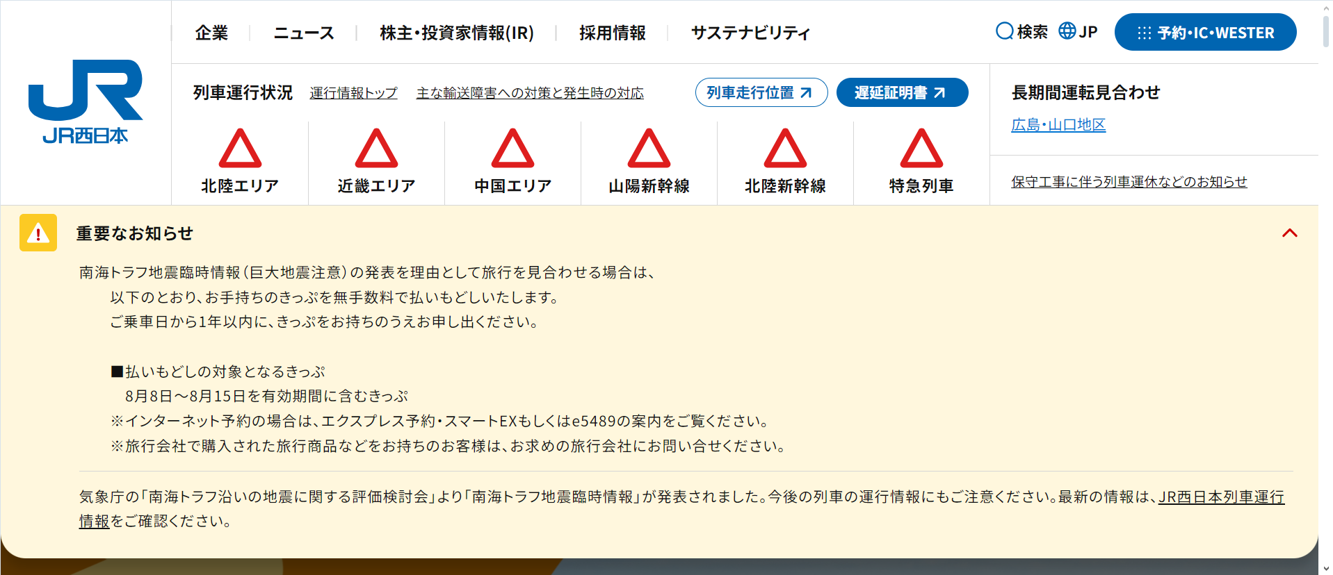 ▲JR西日本Webサイト上の払いもどしの案内
