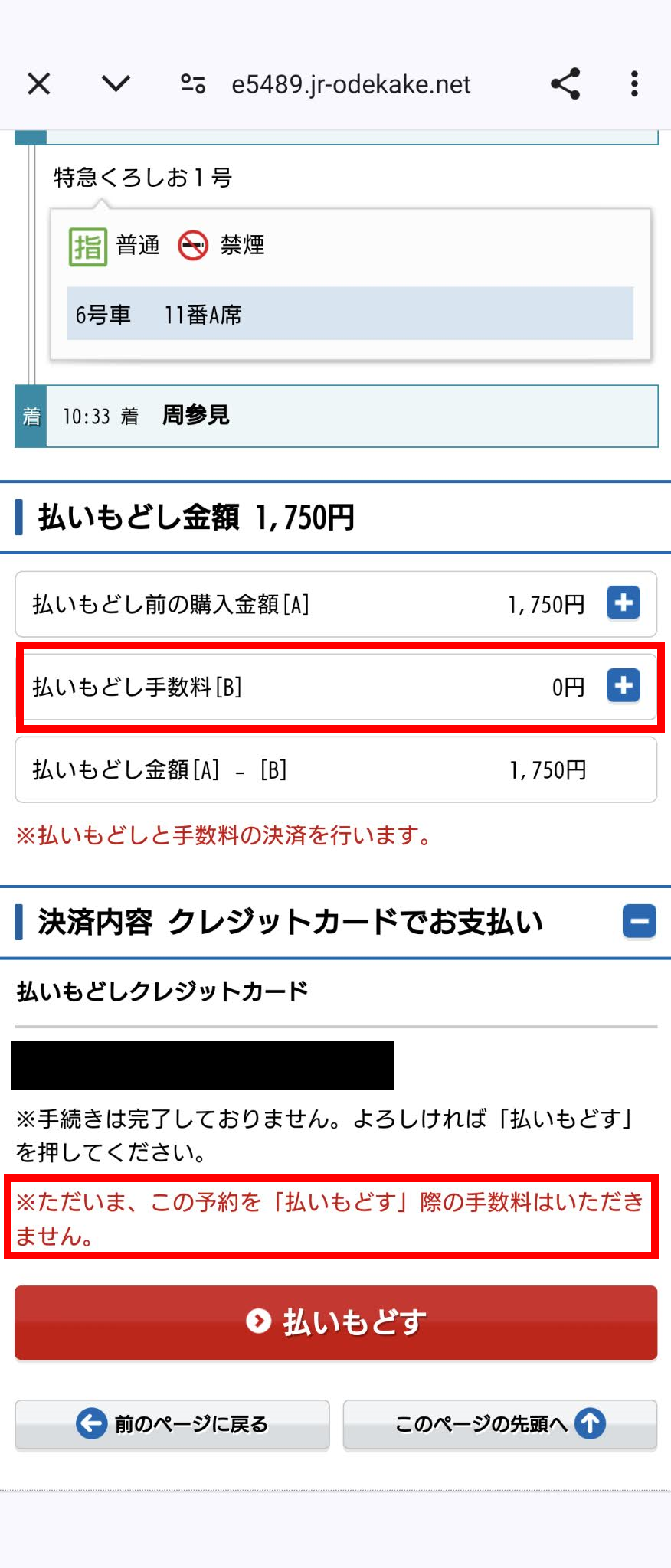 赤枠のとおり「払いもどし手数料[B]」が0円となっており、また、先の画面と同様、「ただいま、この予約を「払いもどす」際の手数料はいただきません。」の案内が表示されています。