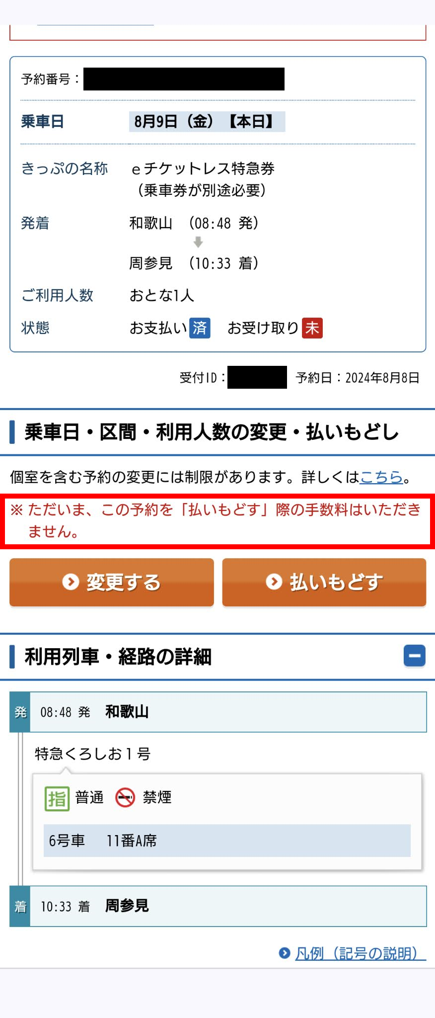 実は私自身、8月9日に和歌山から周参見まで、特急「くろしお1号」に乗車する予定としており、JR西日本インターネット予約「e5489」でチケットレス特急券を購入していましたが、上述のとおり運休となったため、念のために予約確認画面を見たところ、手数料無しで払いもどしできるようになっていることから、操作を続けてみることにしました。