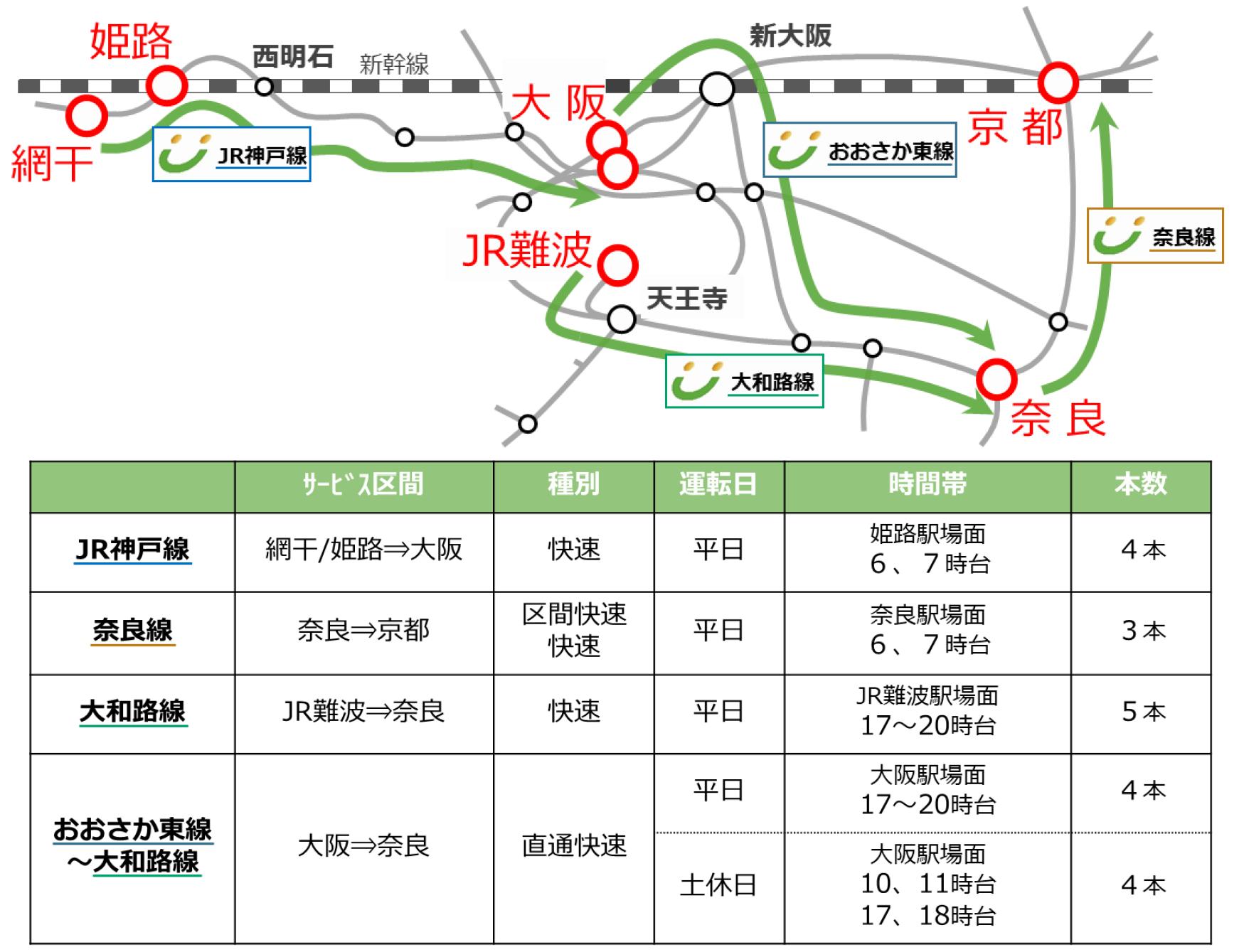 おおさか東線〜大和路線:(平日・土休日)大阪⇒奈良(直通快速)平日夕方4本、土休日朝2本・夕方2本