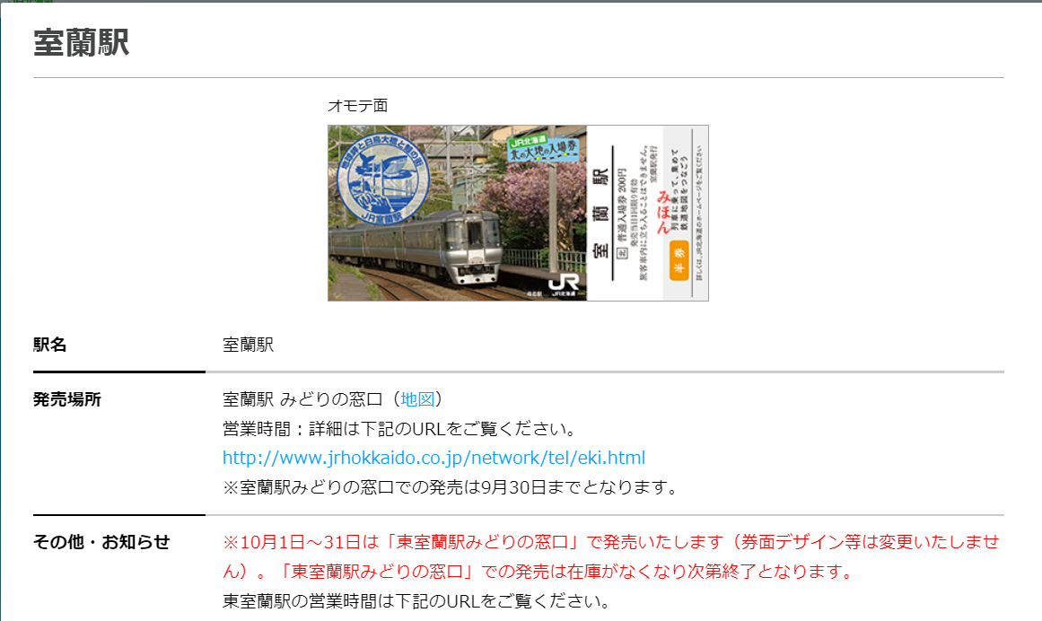 現在は、下記の「北の大地の入場券」が発売されていますが、無人化後は東室蘭駅で10月31日まで発売されます。