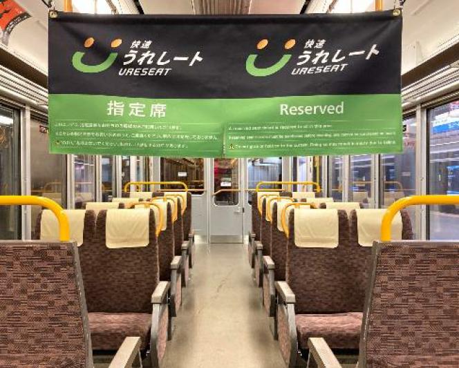 近年通勤車両で増えつつある、有料の座席指定サービス。専用車両を用意した例もあるなかで、JR 西日本はもともと転換クロスシートの車両を使っていたこともあり、設備には手をつけず、普通席との間に暖簾を下げることで識別した。おかげでチケットレス予約では 300 円という低料金で利用できる。評判は良いようで、最新情報では導入路線が増えるとのこと。既存の設備を有効活用して利用者のニーズに応えるべく、暖簾を選んだ発想に感心した。