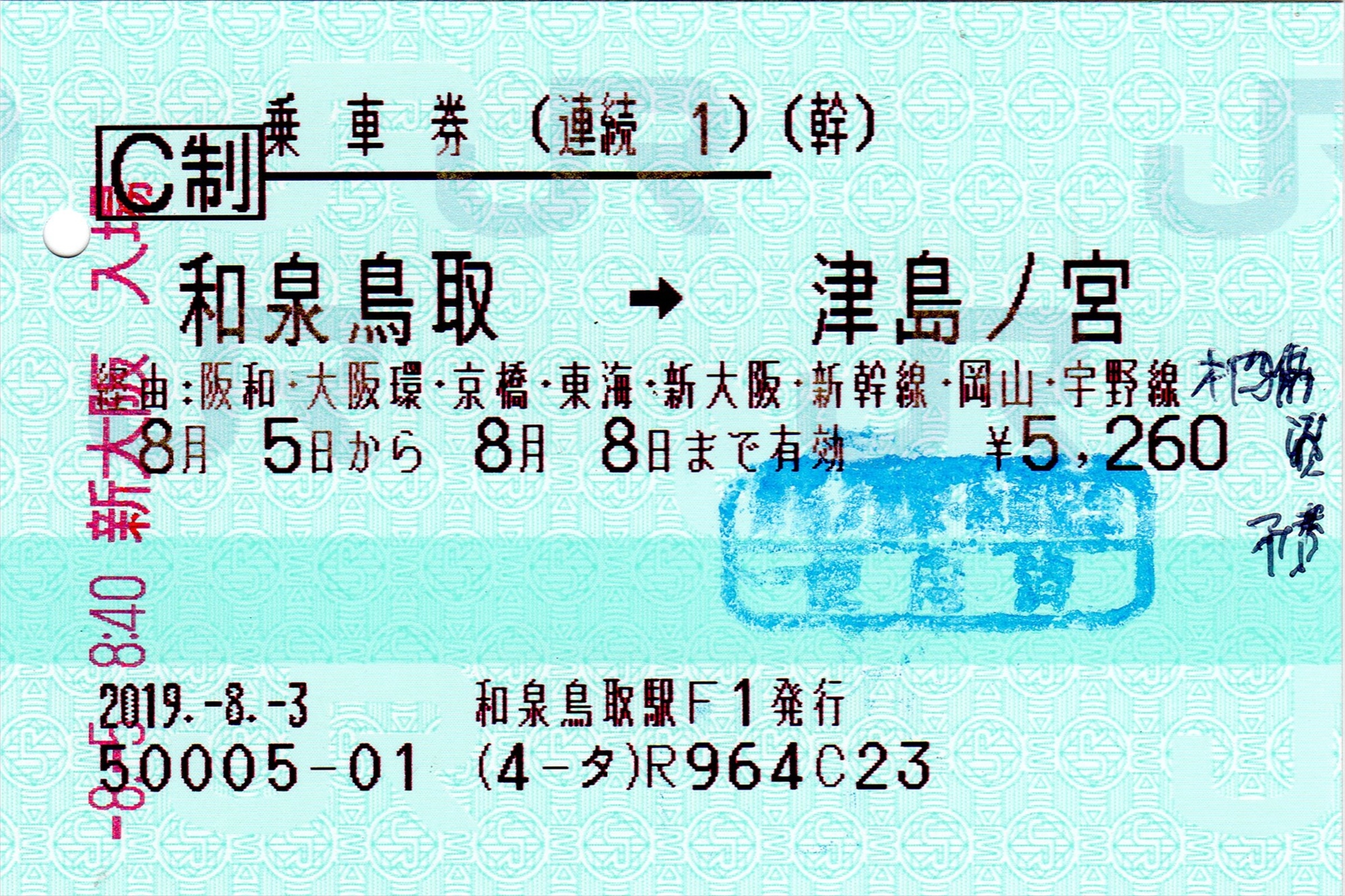 ▲和泉鳥取⇒津島ノ宮、津島ノ宮⇒(讃)高松の連続乗車券。