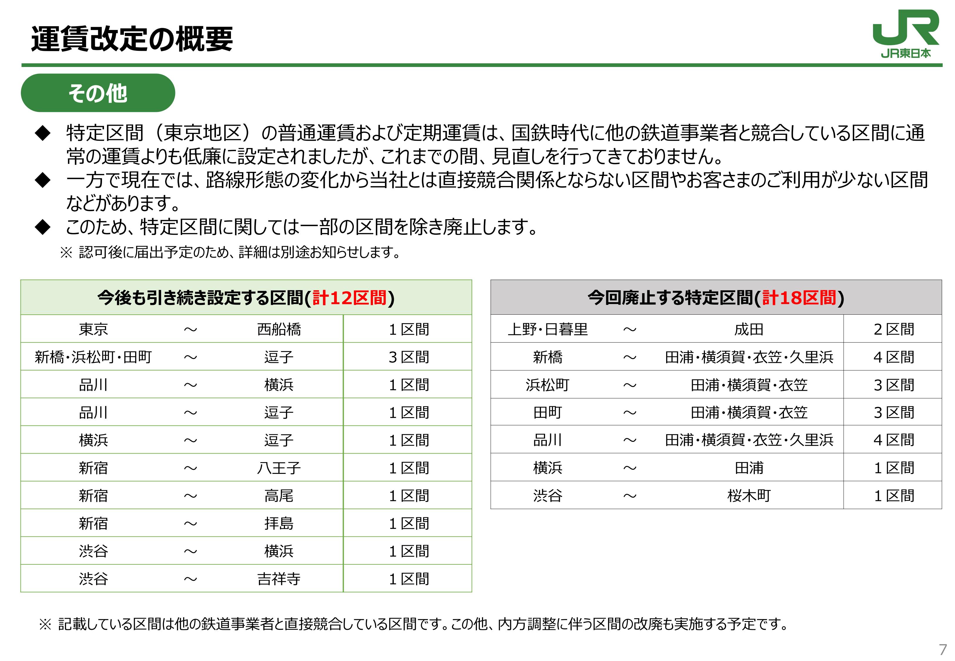 ・特定区間(東京地区)の普通旅客運賃及び定期旅客運賃は、一部を除き廃止