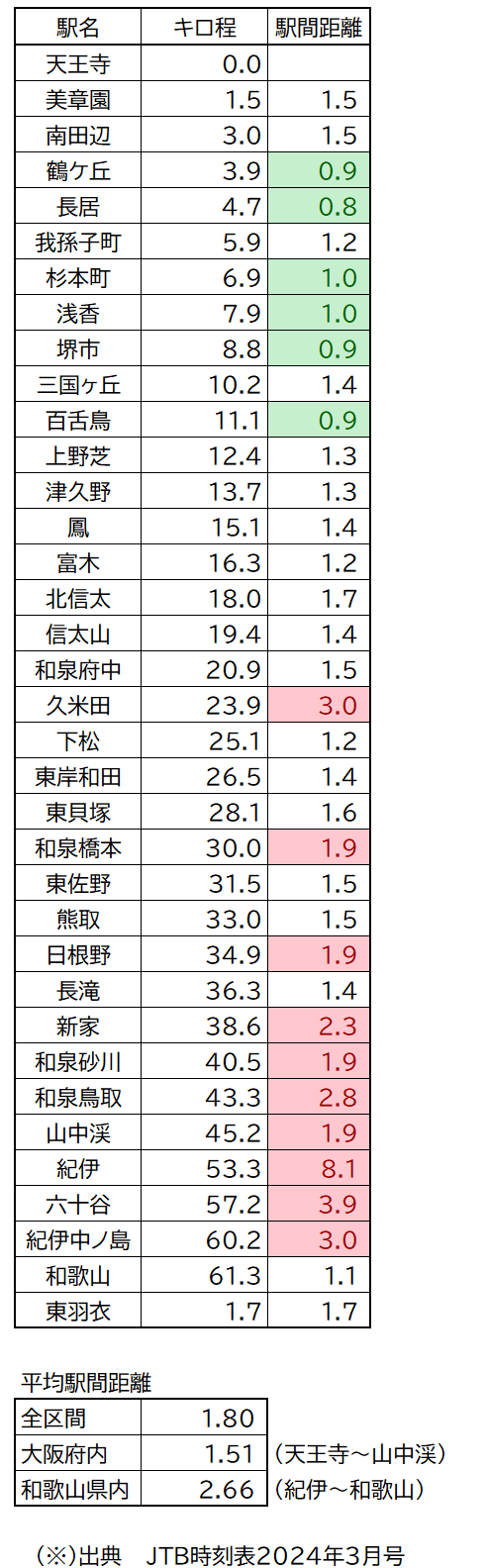 赤字の箇所は駅間が長い区間、緑地の箇所は駅間の短い区間となります。