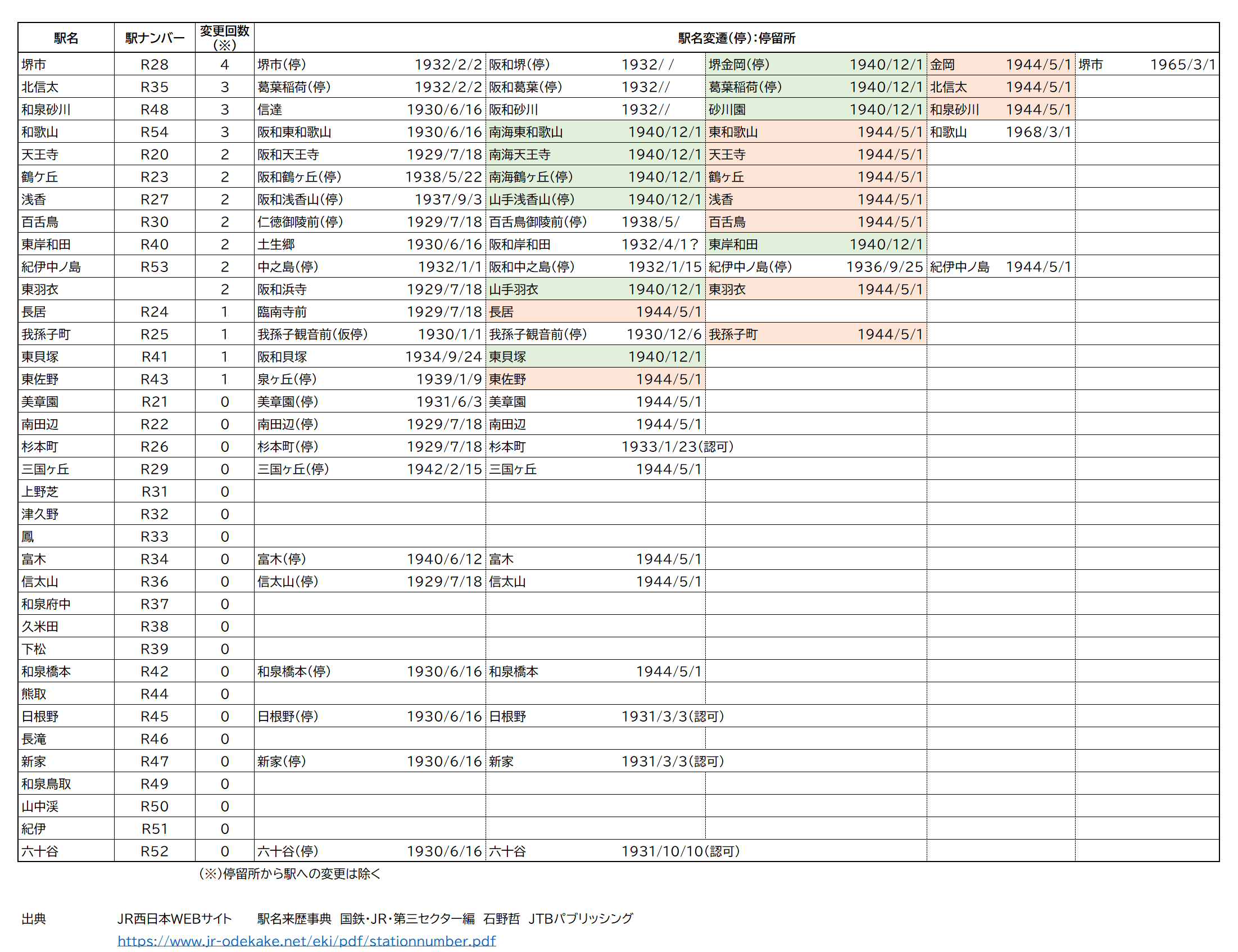 上記の駅名変更の一覧では、薄緑で着色した箇所が「南海鉄道との合併」の際に改称された駅名、そして薄オレンジで着色した箇所が「国による買収」の際に改称された駅名を示しています。