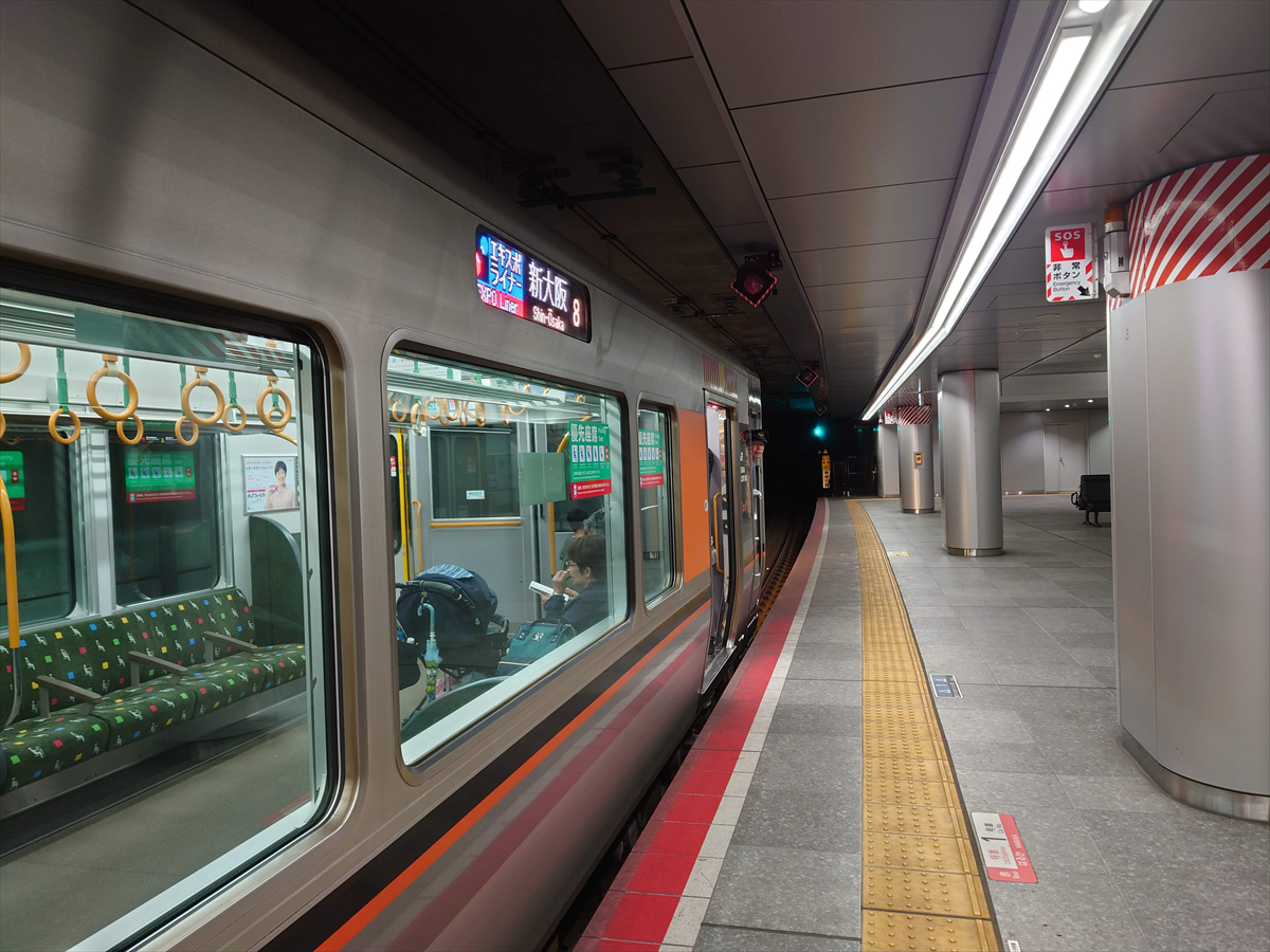 多数並んでいたUSJ帰りの客のうち、新大阪方面へ向かう客が少々乗って、次の停車駅・大阪に向かいます。