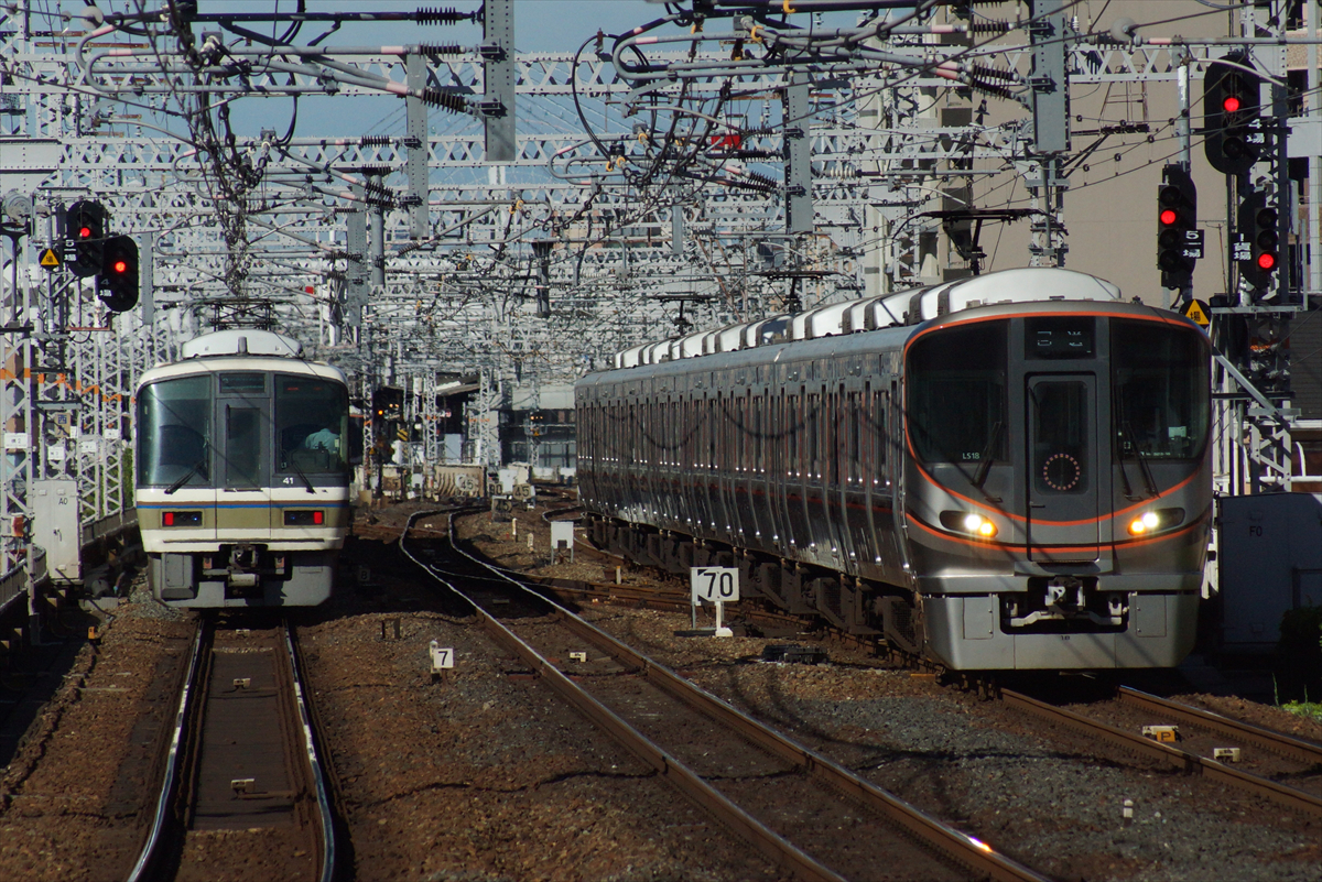 ▲221系大和路快速と、323系「エキスポライナー」の回送列車との並び。