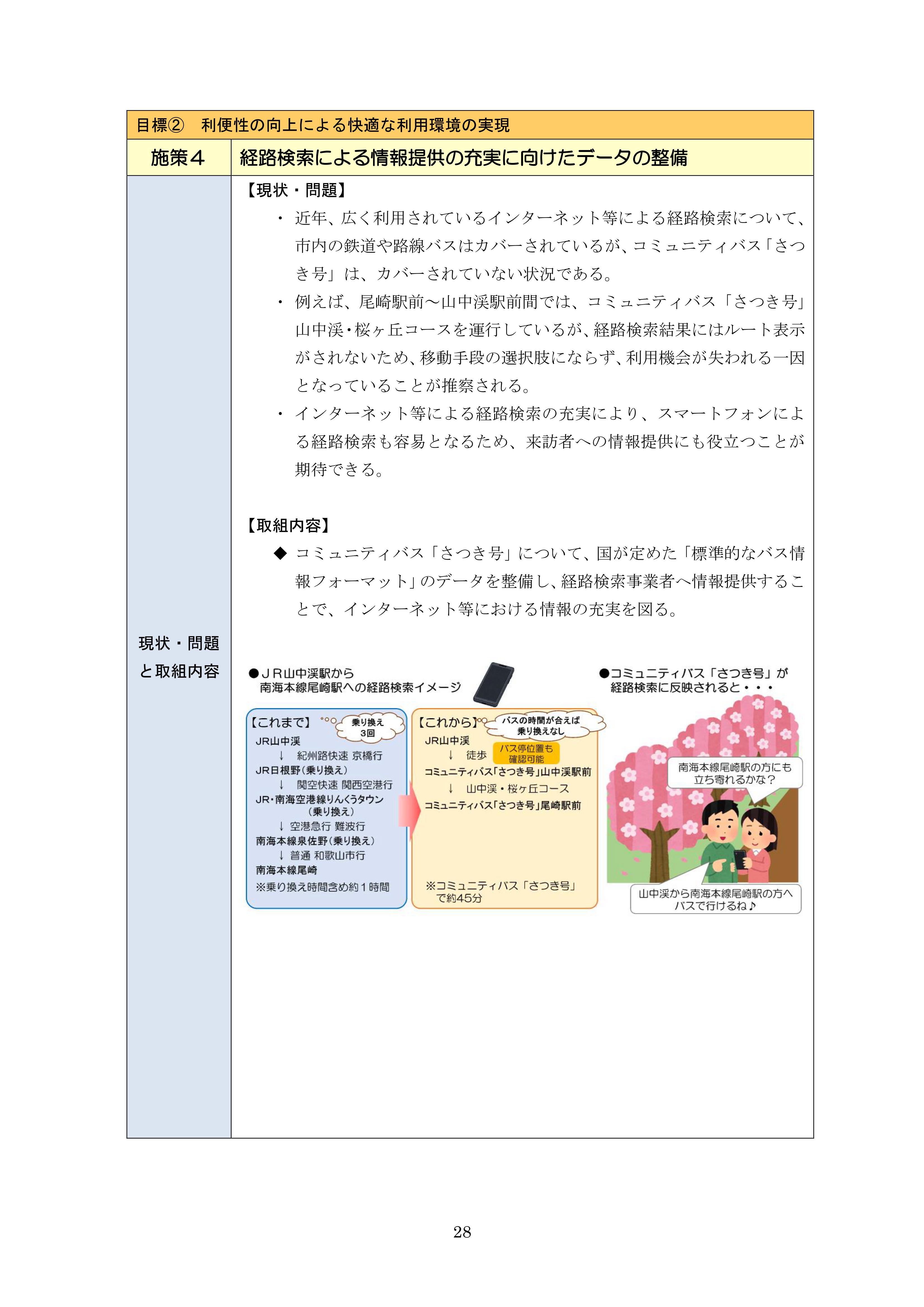2020年3月に阪南市が策定した「阪南市地域公共交通網形成計画」では、「利便性の向上による快適な利用環境の実現」に向けた施策の一つとして「経路検索による情報提供に向けたデータの整備」に取り組むこととしており、具体的な取組内容として「コミュニティバス「さつき号」について、国が定めた「標準的なバス情報フォーマット」のデータを整備し、経路検索事業者へ情報提供することで、インターネット等における情報の充実を図る」こととしています。