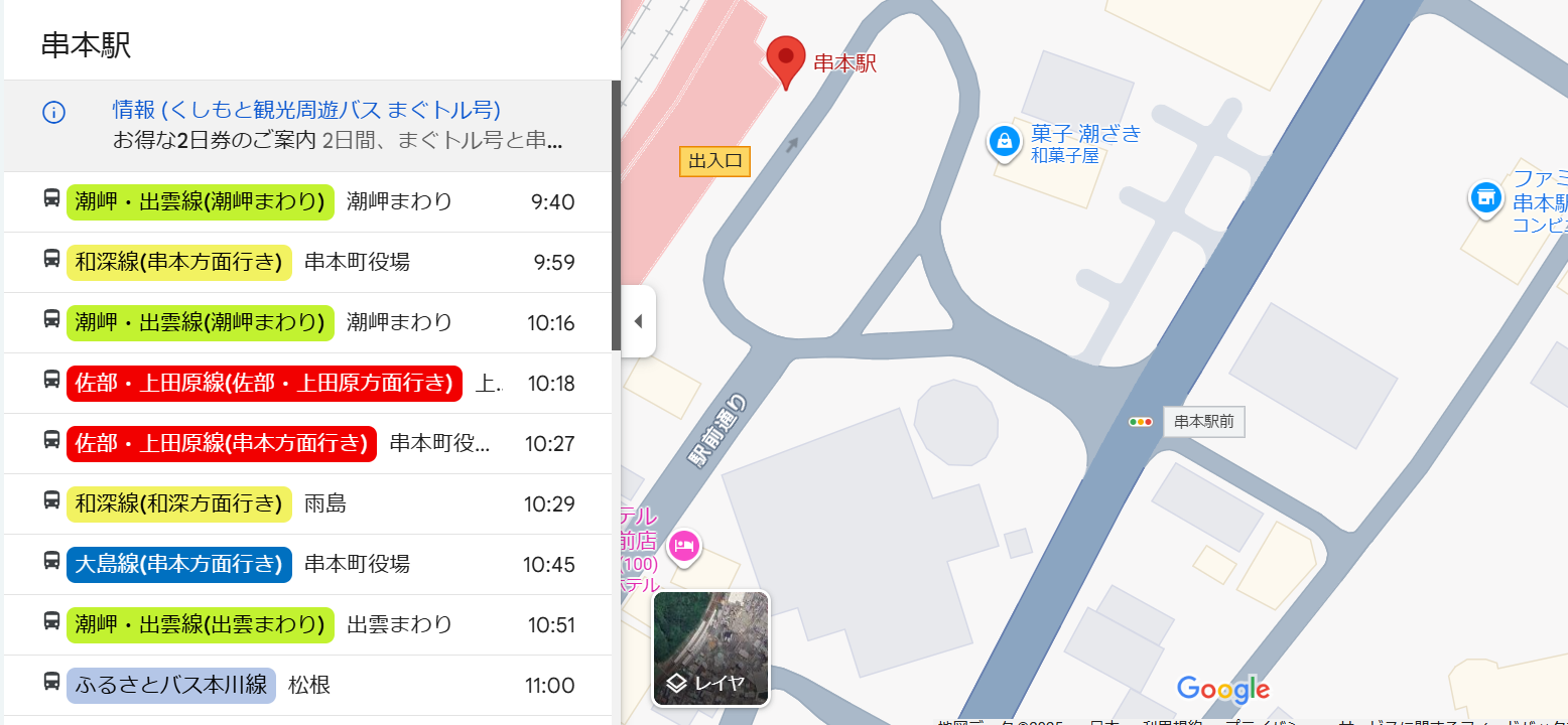 ▲例えば和歌山県串本町が運営しているコミュニティバスでは、このGTFSによるデータ整備がおこなわれており、串本駅から町内各地に向かうコミュニティバスの時刻や運行ルートがGoogleマップ上で容易に確認することが可能です。
