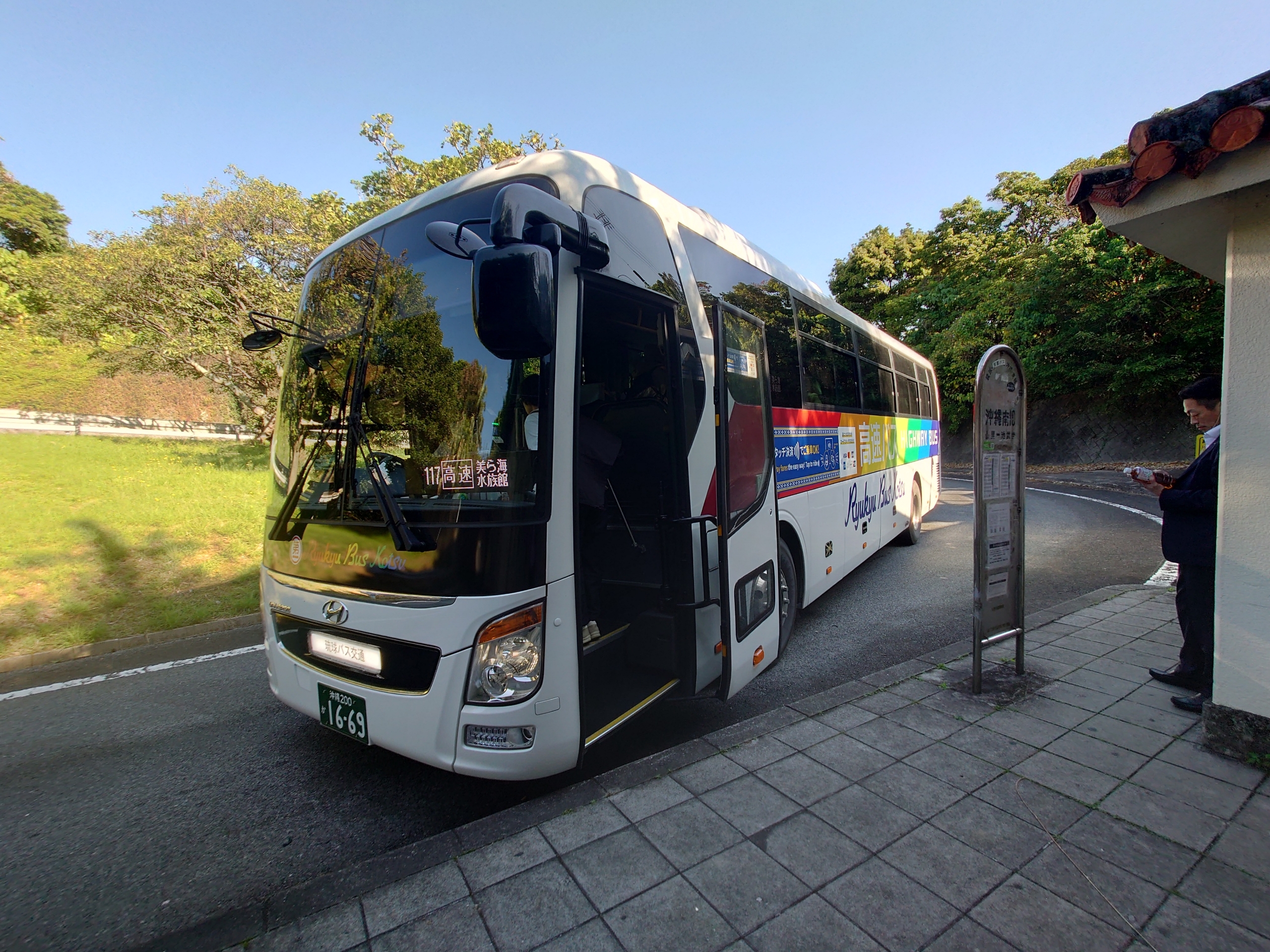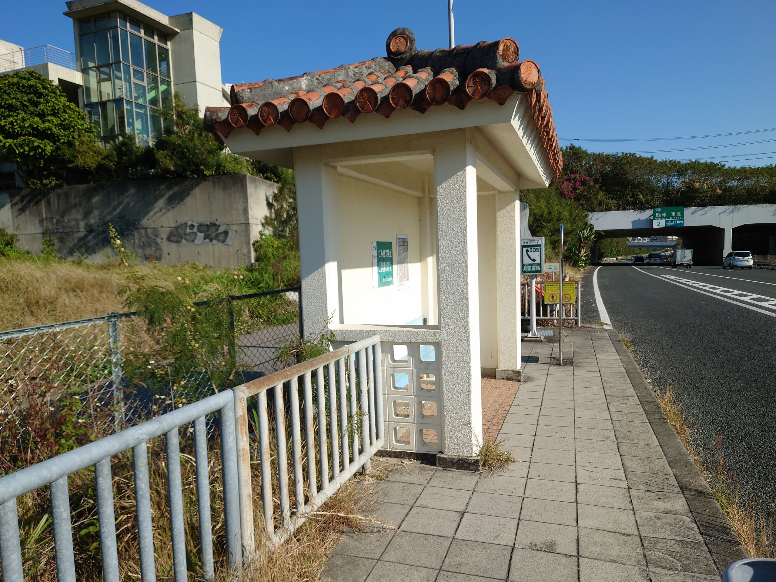 ゆいレールてだこ浦西駅で完全乗車を果たした後、位置情報ゲーム「ステーションメモリーズ」の沖縄県内達成のため、少し北上する必要があるため、てだこ浦西駅より徒歩5分ほどにある、沖縄自動車道上の「幸地」バス停より、名護行きの高速バスに乗車します。