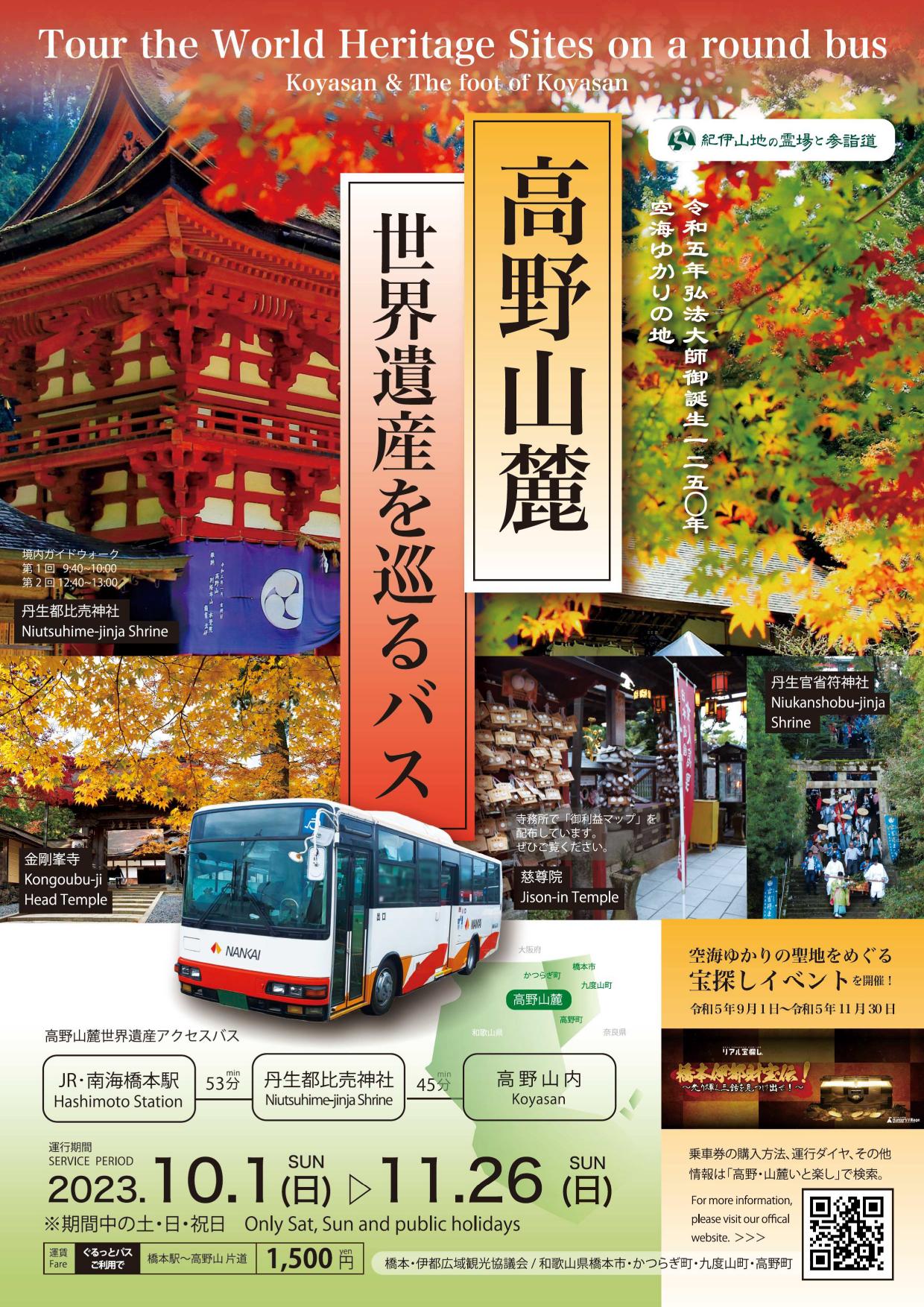 昨年に引き続き、10月・11月の土休日に、橋本駅前〜丹生都比売神社前〜高野山(奥の院前)で、高野山麓を巡るアクセスバスが運行されます。