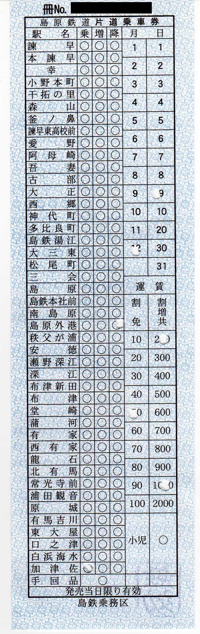 渡されたのは、駅名・金額等があらかじめ印刷されていて、該当する箇所をパンチで穴を開けるタイプの乗車券でした。